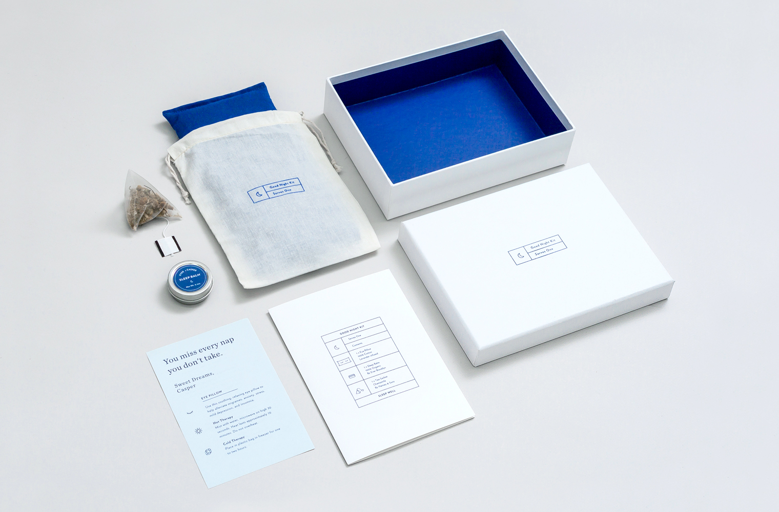 Design and production for Casper’s Good Night Kit, gifted to anyone who purchases a $50 gift card. The kit includes a lavender eye pillow, an aromatherapeutic sleep balm, and a chamomile tea sachet.